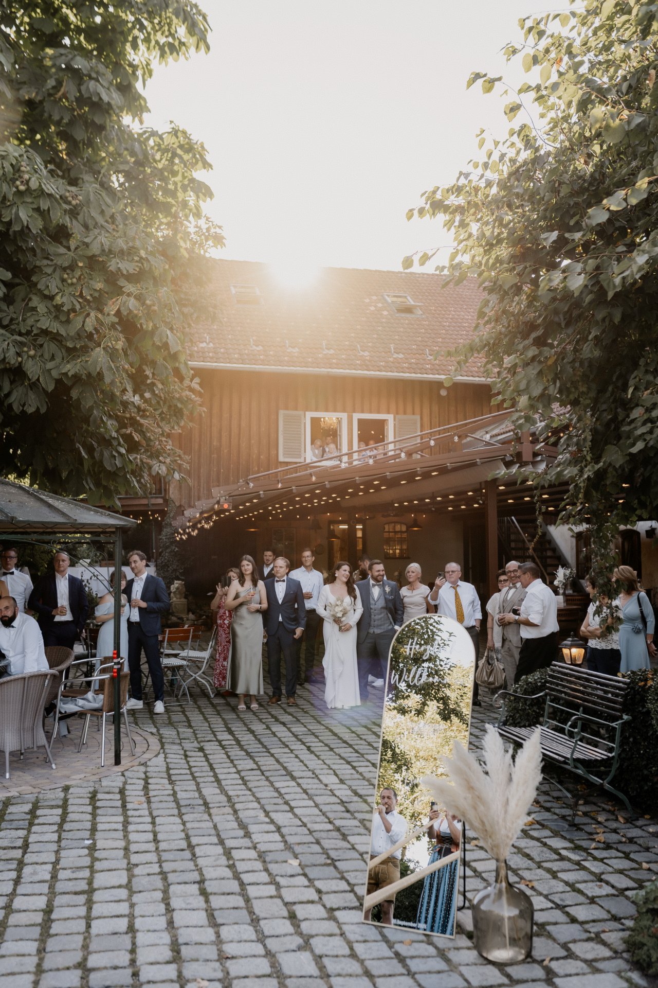 Unser Innenhof am Gauklerhof ist wie eine „gute Stube im Freien“ – mit schattenspendenden Bäumen, großzügigen Flächen und fast mediterranem Flair. Hier beginnt oft euer Fest, denn der Empfang der Gäste findet in diesem besonderen Ambiente statt.