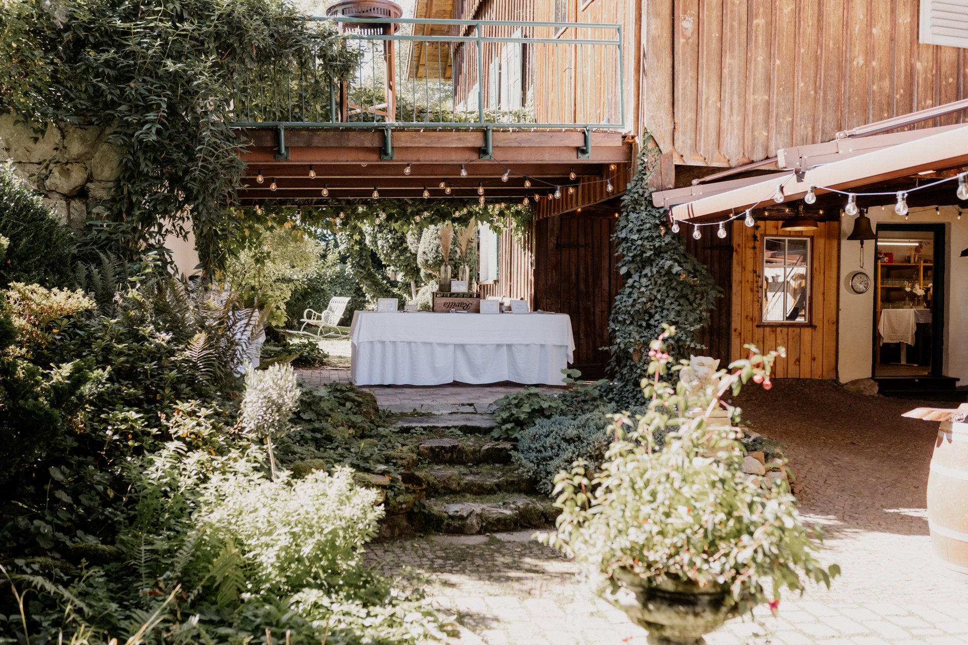Der Gauklerhof – eure exklusive Hochzeitslocation im Allgäu mit mediterranem Innenhof und festlichem Gästeempfang.